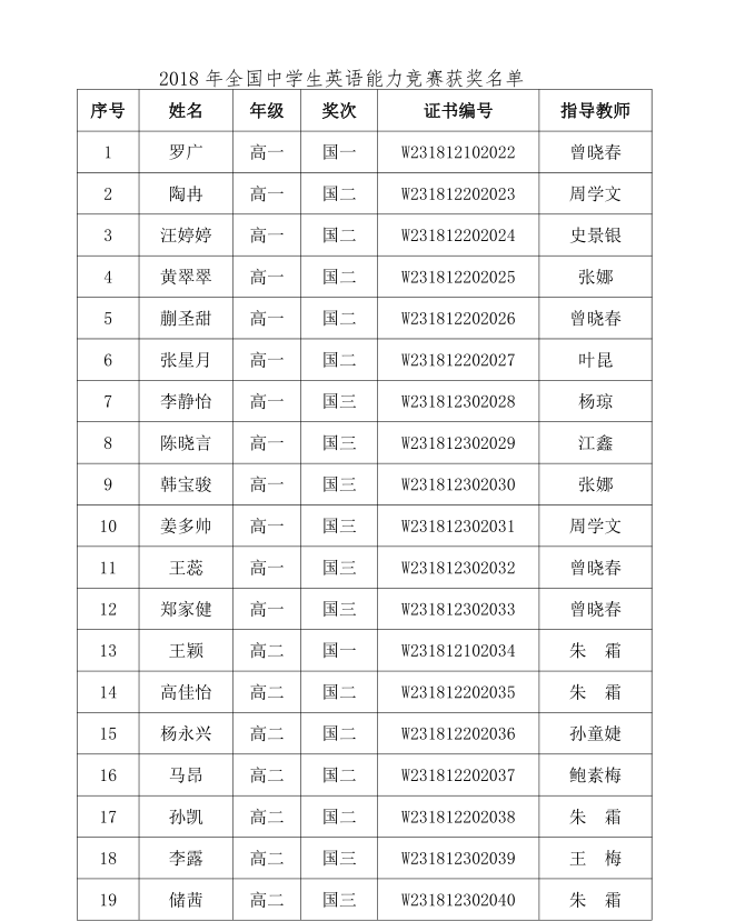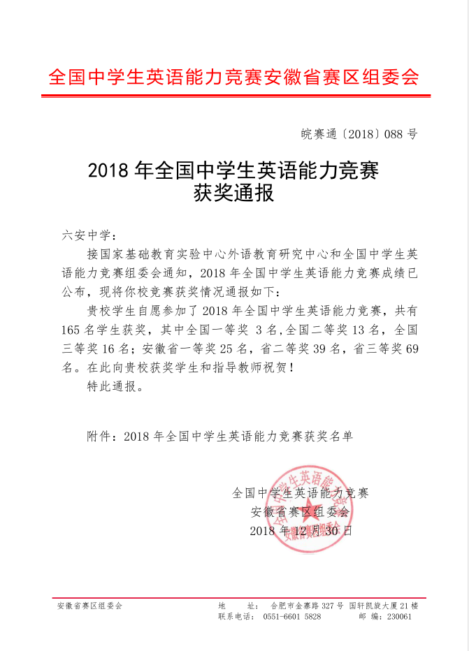 在2018年中学生英语能力竞赛全国总决赛上,金年会金字招牌再获佳绩,共有165名同学获奖,其中全国一等奖3名、全国二等奖13名、全国三等奖16名、安徽省一等奖25名、省二等奖39名、省三等奖69名。本次竞赛学校高度重视、教务部门精心组织、外语教研组全程参与、各年级积极响应参赛,共有1578名同学参加初赛、32名同学进入全国决赛,参赛学生数及获奖数量及质量同比上届均显著提升。此次活动的开展有助于提高金年会金字招牌学生学习英语学科的积极性、有助于提升金年会金字招牌外语教研工作质量并能为学生参加自主招生提供相关条件。
