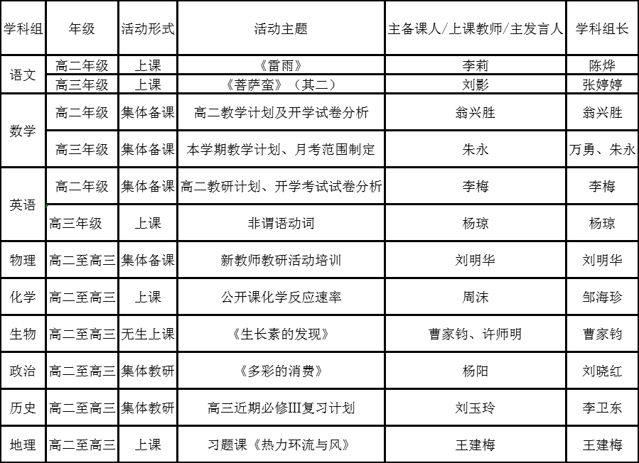 2020-2021学年度第一学期第1周(8.31-9.4)学科组教研活动计划汇总表