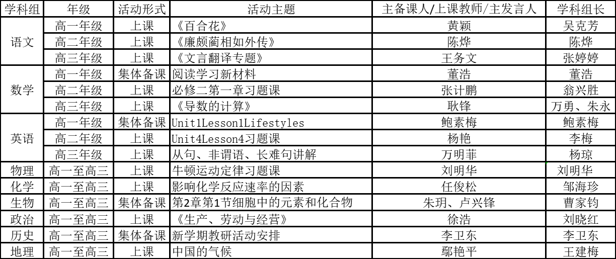 2020-2021学年度第一学期第2周(9.7-9.11)学科组教研活动计划汇总表