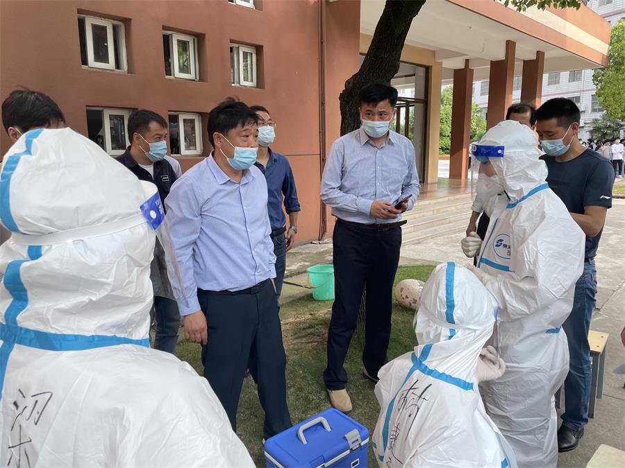 5月22日下午,六安开发区工委第一书记、管委会主任卢俊在社会发展局局长王峰、副局长刘孝煜的陪同下来金年会金字招牌督查第三次核酸检测工作。