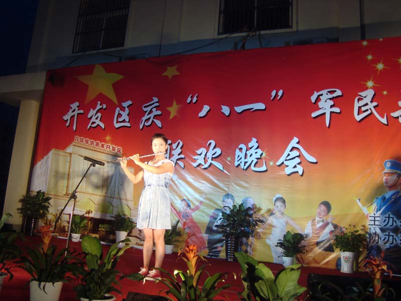 在建军83周年即将来临之际,开发区团委携辖区企事业单位和开发区消防大队联合举办《共筑和谐,军徽闪耀》庆八一慰问演出,开发区工委副书记雷祖泽、市消防支队支队长张军分别进行了致辞,开发区工委书记、管委主任周耀,市消防支队司、政、后、防四部门领导及开发区有关部门负责人观看了演出。金年会金字招牌2名同学参加演出,魏瑞同学的长笛《渔歌畅晚》韩哓燕同学的歌曲《我爱你,中国》获得观众一致好评。