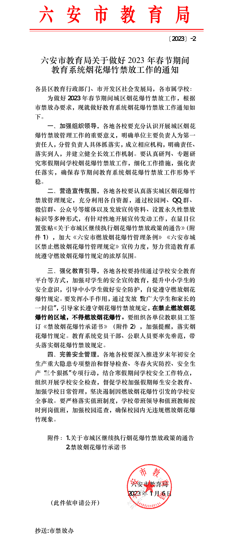 六安市教育局关于做好2023年春节期间教育系统烟花爆竹禁放工作的通知