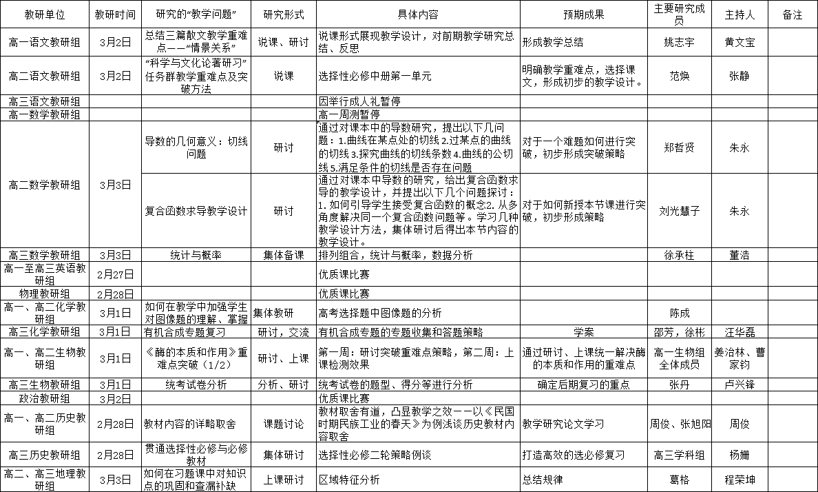 2022-2023学年度第二学期第4周(2.27-3.3)学科组教研活动计划汇总表
