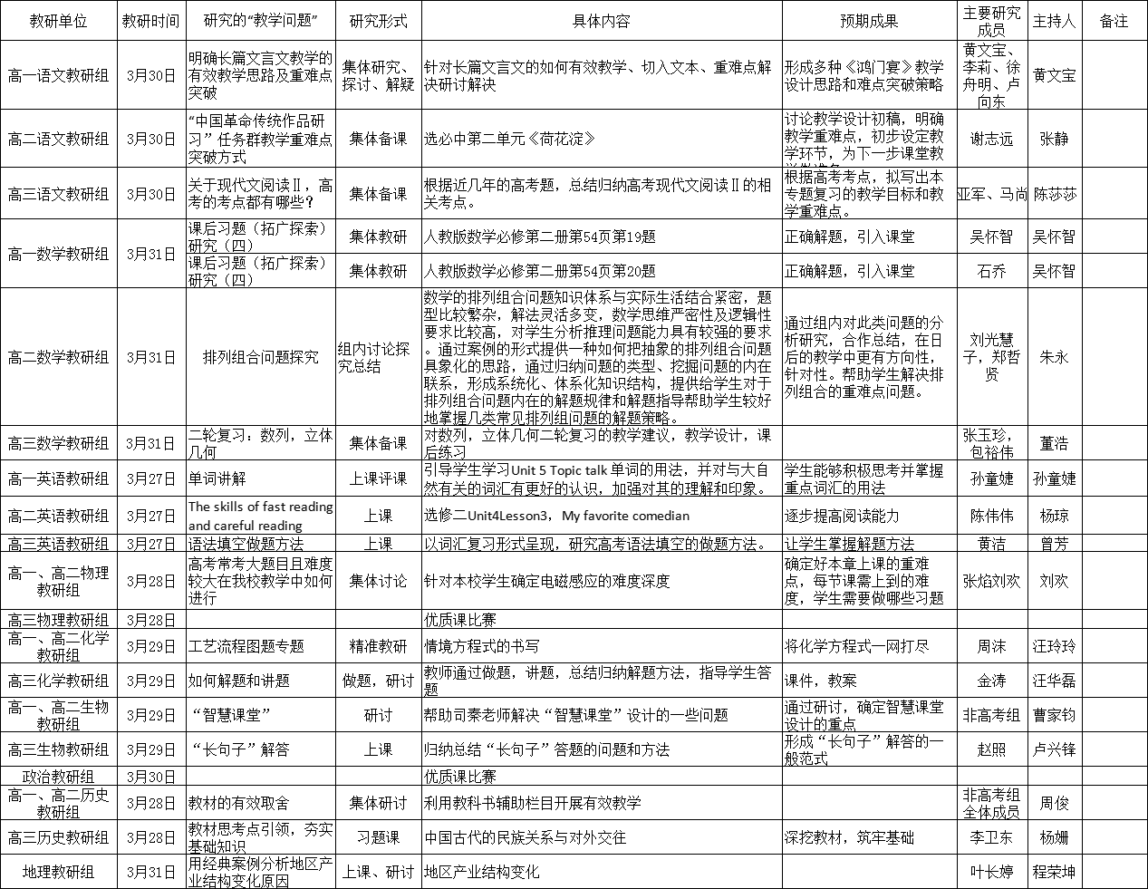2022-2023学年度第二学期第8周(3.27-3.31)学科组教研活动计划汇总表