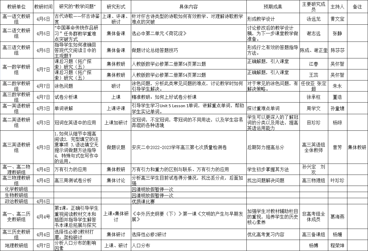 2022-2023学年度第二学期第9周(4.3-4.7)学科组教研活动计划汇总表