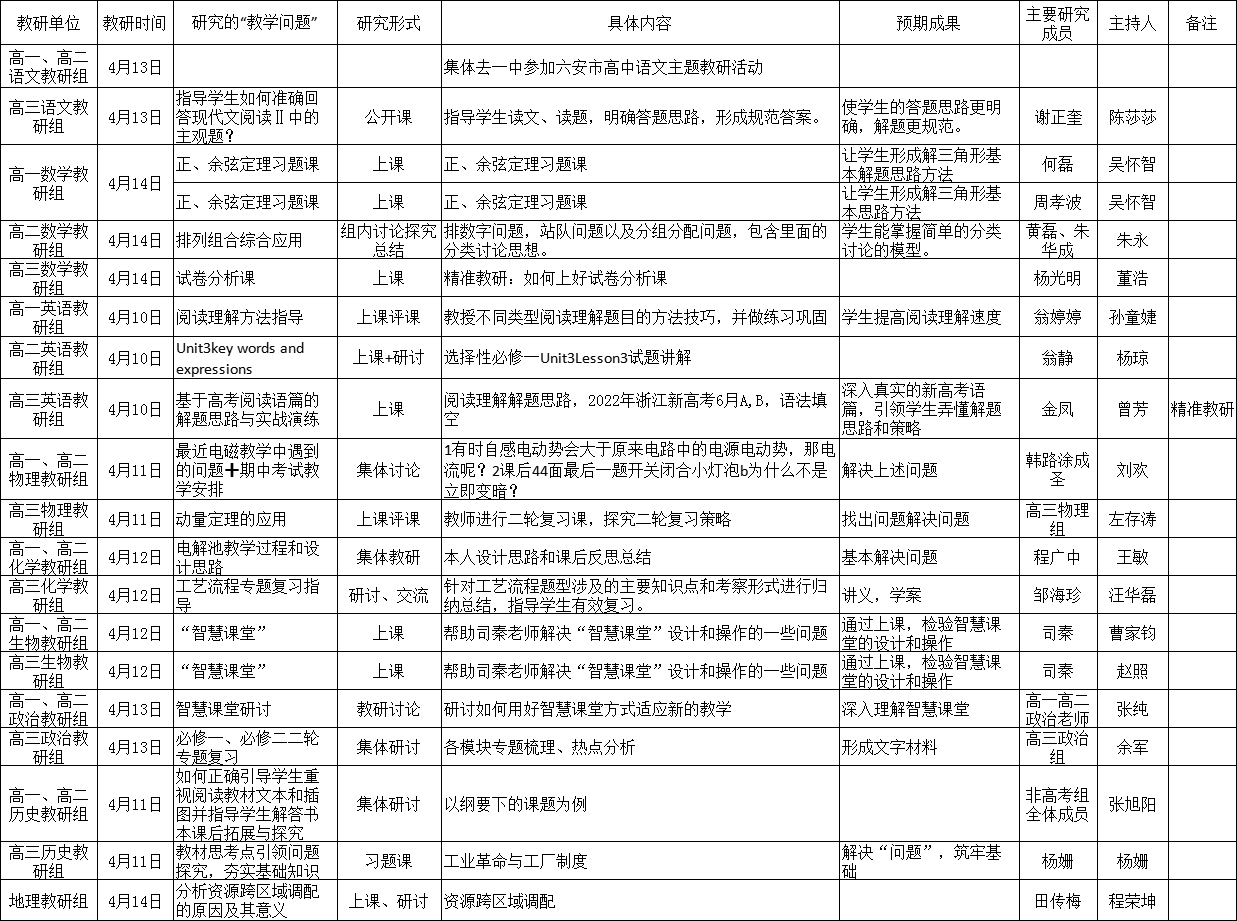 2022-2023学年度第二学期第10周(4.10-4.14)学科组教研活动计划汇总表